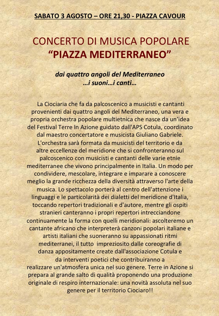 CONCERTO DI MUSICA POPOLARE “PIAZZA MEDITERRANEO” Una produzione TerreInAzione – Maestro Concertatore Giuliano Gabriele Mi piace Caricamento...